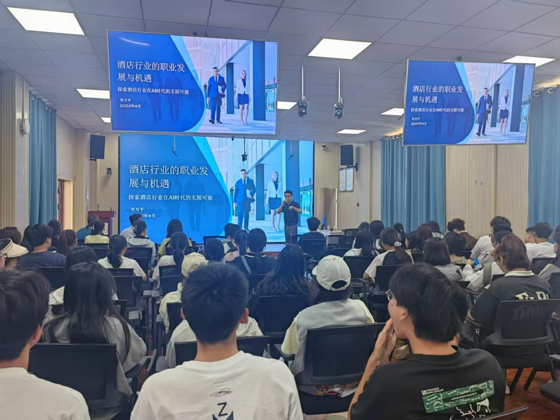 为搭建理论与行业需求的桥梁,激发学生对专业领域的深度思考,助力学生职业规划,同时为稳步推进“一院一品”特色校园文化项目建设,4月14日下午,旅游学院举办“酒店行业的职业发展与机遇——探索酒店行业在AI时代的无限可能”主题讲座,特邀海南澄迈富力希尔顿逸林度假酒店总经理李万平担任主讲嘉宾。本次讲座为“文旅大讲堂”2025年第二讲,讲座由学院副院长赵志峰主持。