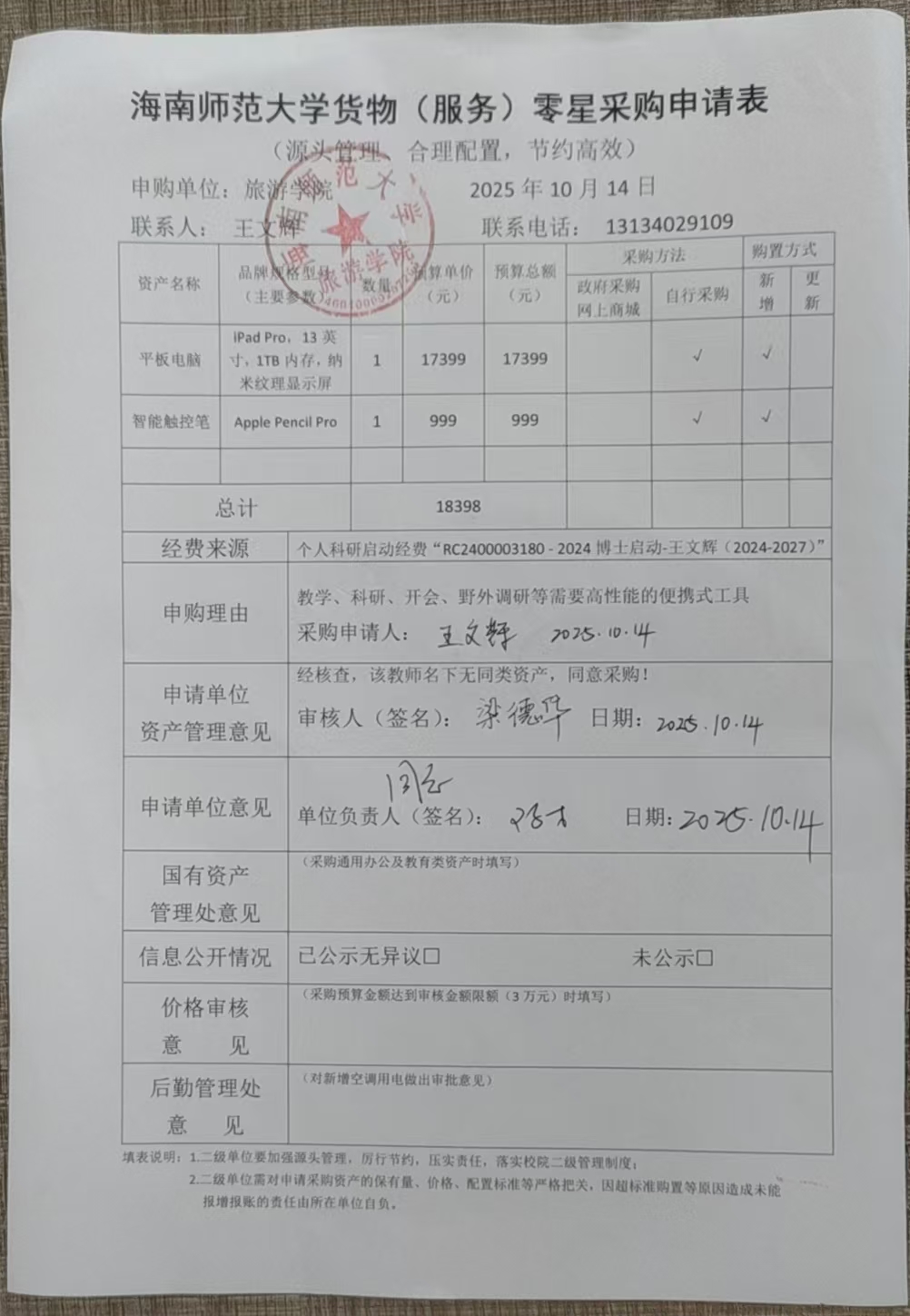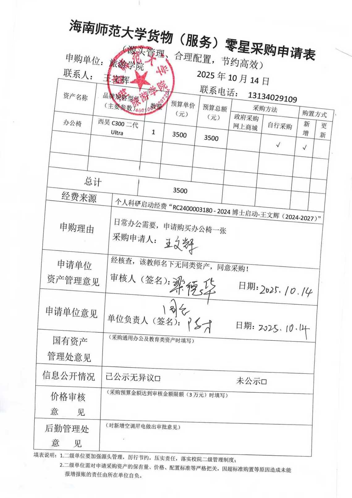 海南师范大学王文辉老师因办公、教学、科研工作需要购置以下设备,根据学校规定,对购置物品明细进行公示如下,如有疑议,请致电0898-65815316