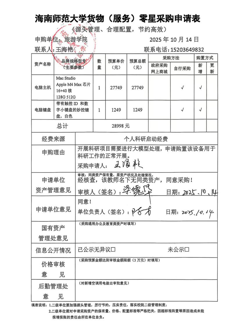 海南师范大学王海艳老师因办公、教学、科研工作需要购置以下设备,根据学校规定,对购置物品明细进行公示如下,如有疑议,请致电0898-65815316