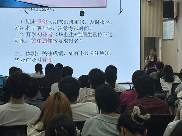最后,教务办刀纤子老师就毕业审核的关键事项作了清晰说明,重点解读了学分、绩点、外语等级及毕业论文等关键要求,提醒同学们高度重视毕业论文,尽早规划准备,并现场解答了同学们的疑问。