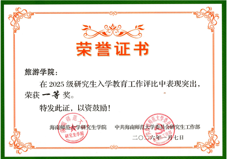 此次获奖,也是对学院研究生教育管理工作的高度认可。未来,旅游学院将以此为契机,持续优化研究生入学教育体系,创新育人模式,提升培养质量,为学校研究生教育高质量发展贡献更大力量。
