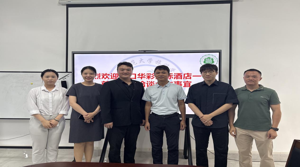 2026年4月14日,海口华彩洲际酒店人力资源总监李海天一行到访海南师范大学旅游学院,就校企合作、人才培养等事宜开展交流洽谈。旅游学院副院长赵志峰、酒店管理系主任卢世文博士、朱志敏老师出席活动。